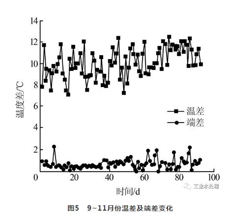 為監測淡/海水在線切換過程中系統運行狀況,比較了2#系統9~11月份的每天10點系統循環水進出口溫差及凝汽器端差,結果見圖5。